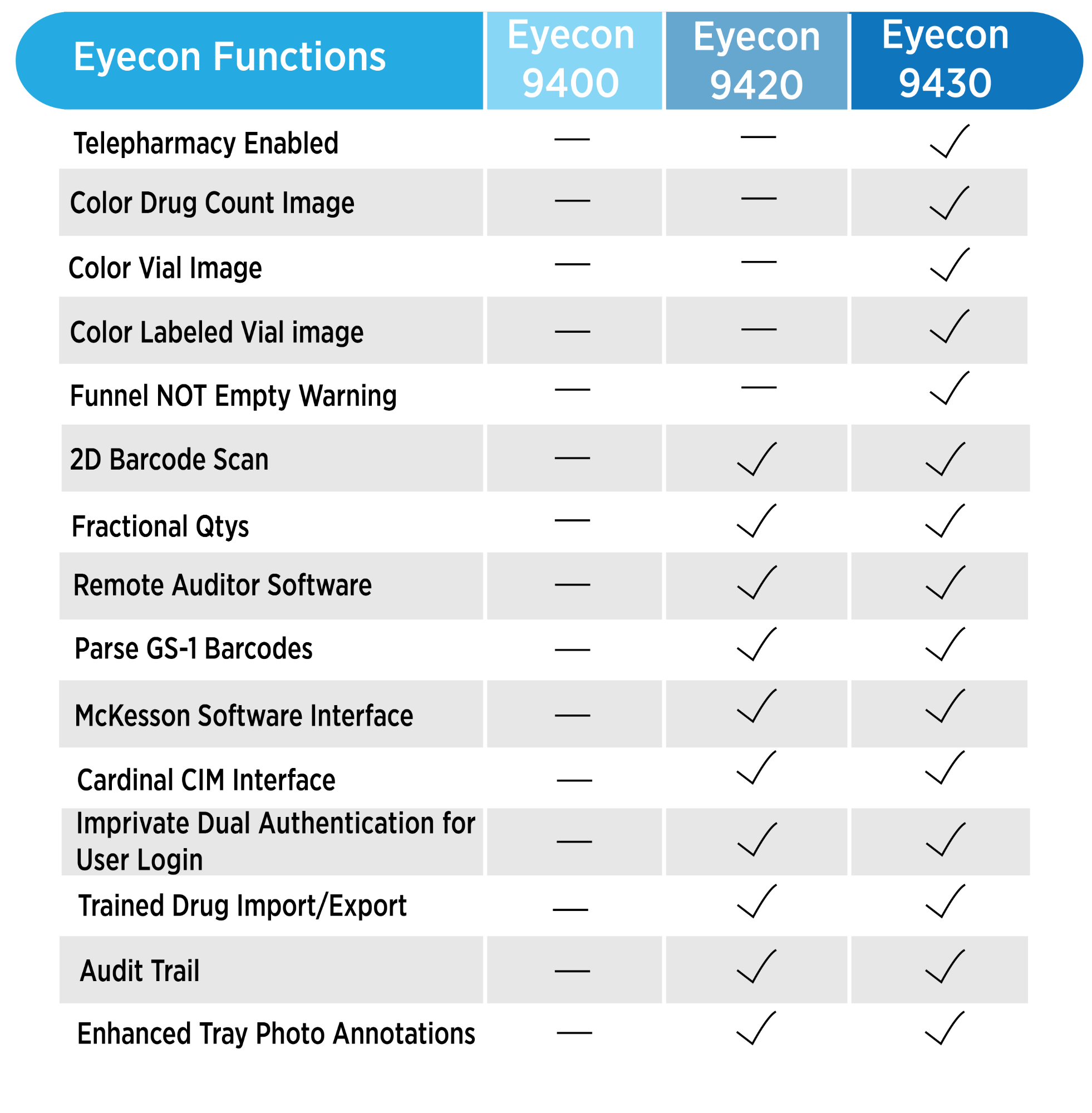 Eyecon continues to become the preferred choice of pharmacies that have decided to improve their prescription filling process. Eyecon 9430 builds on the revolutionary technology of the original Eyecon machine, with enhanced features that take the system to the next level.